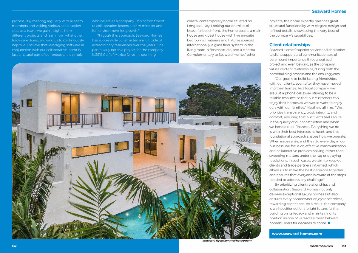 By prioritizing client relationships and collaboration, Seaward Homes not only delivers exceptional luxury homes but also ensures every homeowner enjoys a seamless, rewarding experience. As a result, the company is well-positioned for a bright future, further building on its legacy and maintaining its position as one of Sarasota’ s most beloved homebuilders for decades to come. ■