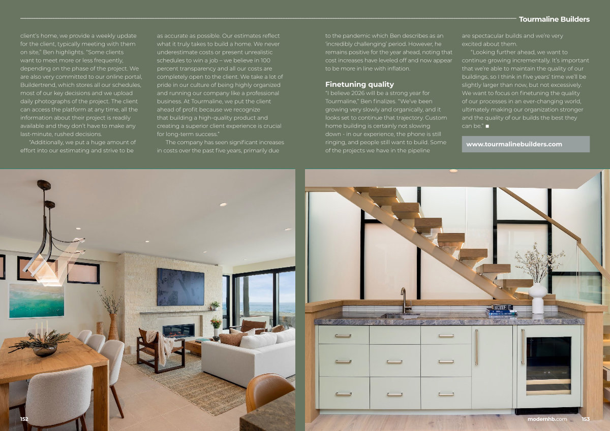 “ Additionally, we put a huge amount of effort into our estimating and strive to be as accurate as possible. Our estimates reflect what it truly takes to build a home. We never underestimate costs or present unrealistic schedules to win a job – we believe in 100 percent transparency and all our costs are completely open to the client. We take a lot of pride in our culture of being highly organized and running our company like a professional business. At Tourmaline, we put the client ahead of profit because we recognize that building a high-quality product and creating a superior client experience is crucial for long-term success.”