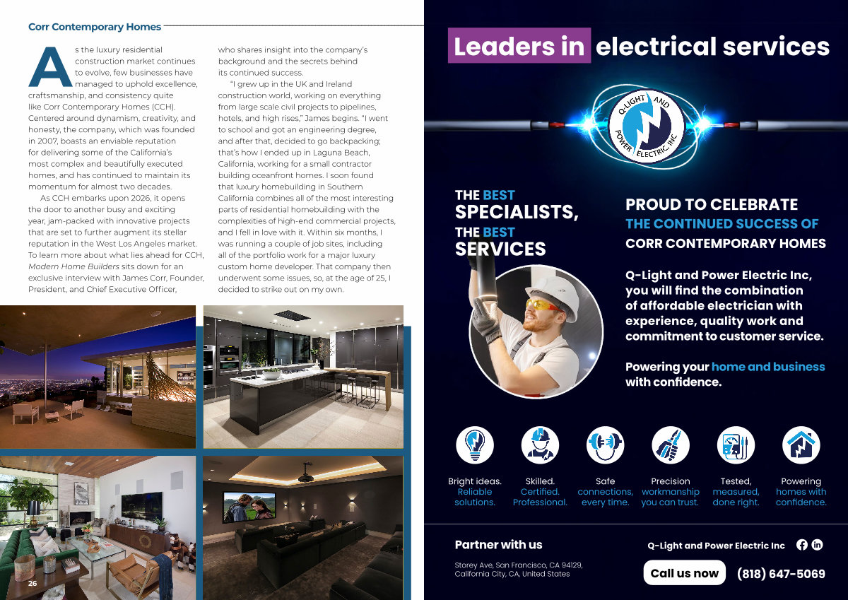 As the luxury residential construction market continues to evolve, few businesses have managed to uphold excellence, craftsmanship, and consistency quite like Corr Contemporary Homes( CCH). Centered around dynamism, creativity, and honesty, the company, which was founded in 2007, boasts an enviable reputation for delivering some of the California’ s most complex and beautifully executed homes, and has continued to maintain its momentum for almost two decades.