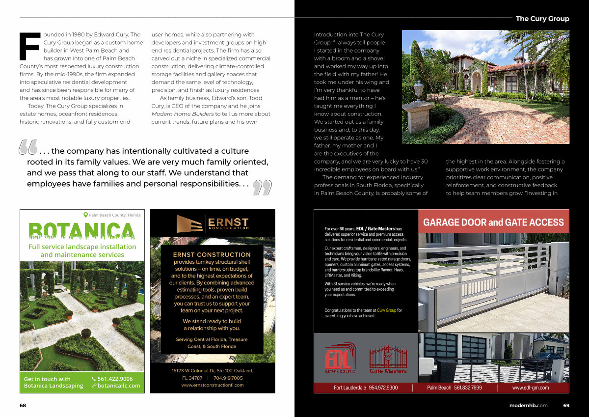 Founded in 1980 by Edward Cury, The Cury Group began as a custom home builder in West Palm Beach and has grown into one of Palm Beach County’ s most respected luxury construction firms. By the mid-1990s, the firm expanded into speculative residential development and has since been responsible for many of the area’ s most notable luxury properties.