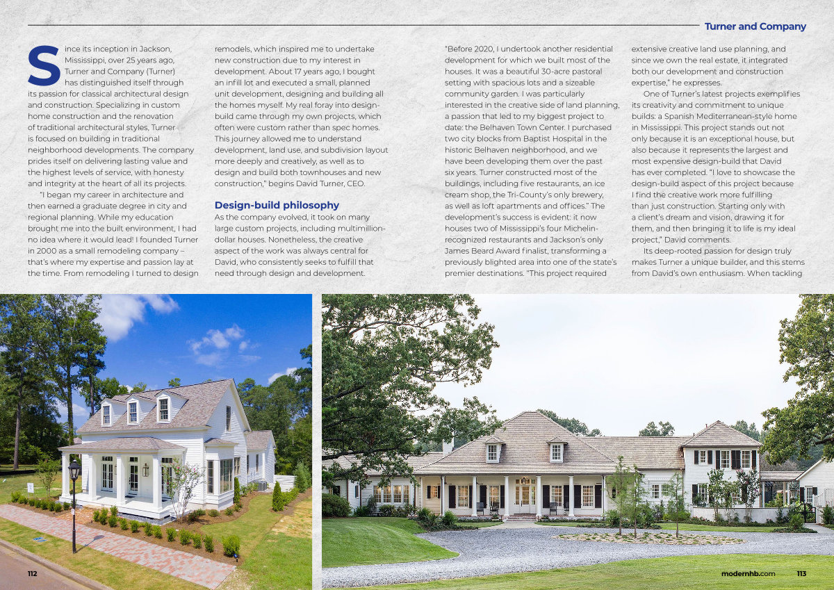 “ Before 2020, I undertook another residential development for which we built most of the houses. It was a beautiful 30-acre pastoral setting with spacious lots and a sizeable community garden. I was particularly interested in the creative side of land planning, a passion that led to my biggest project to date: the Belhaven Town Center. I purchased two city blocks from Baptist Hospital in the historic Belhaven neighborhood, and we have been developing them over the past six years. Turner constructed most of the buildings, including five restaurants, an ice cream shop, the Tri-County’ s only brewery, as well as loft apartments and offices.” The development’ s success is evident: it now houses two of Mississippi’ s four Michelinrecognized restaurants and Jackson’ s only James Beard Award finalist, transforming a previously blighted area into one of the state’ s premier destinations.“ This project required extensive creative land use planning, and since we own the real estate, it integrated both our development and construction expertise,” he expresses.