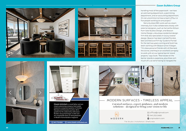 Closets Unlimited is a small father and son closet customizing company that installs melamine component systems in Florida’ s Manatee and Sarasota counties. We’ re grateful for the relationship with Eason Builders Group that began in 2015 and we congratulate them on being featured in Modern Home Builders magazine!