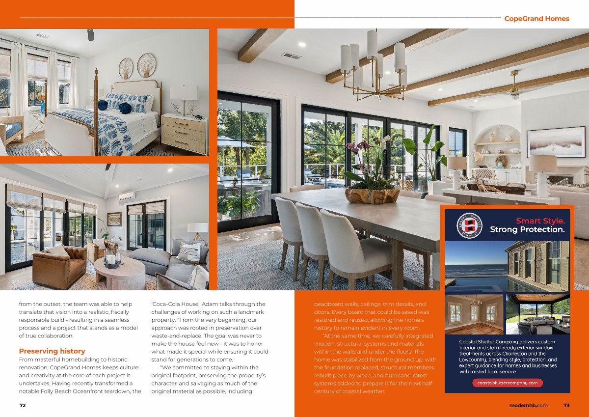 From masterful homebuilding to historic renovation, CopeGrand Homes keeps culture and creativity at the core of each project it undertakes. Having recently transformed a notable Folly Beach Oceanfront teardown, the