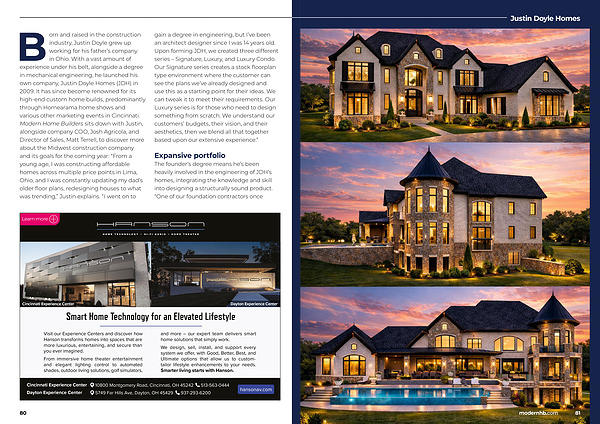 Born and raised in the construction industry, Justin Doyle grew up working for his father’ s company in Ohio. With a vast amount of experience under his belt, alongside a degree in mechanical engineering, he launched his own company, Justin Doyle Homes( JDH) in 2009. It has since become renowned for its high-end custom home builds, predominantly through Homearama home shows and various other marketing events in Cincinnati. Modern Home Builders sits down with Justin, alongside company COO, Josh Agricola, and Director of Sales, Matt Terrell, to discover more about the Midwest construction company and its goals for the coming year:“ From a young age, I was constructing affordable homes across multiple price points in Lima, Ohio, and I was constantly updating my dad’ s older floor plans, redesigning houses to what was trending,” Justin explains.“ I went on to gain a degree in engineering, but I’ ve been an architect designer since I was 14 years old. Upon forming JDH, we created three different